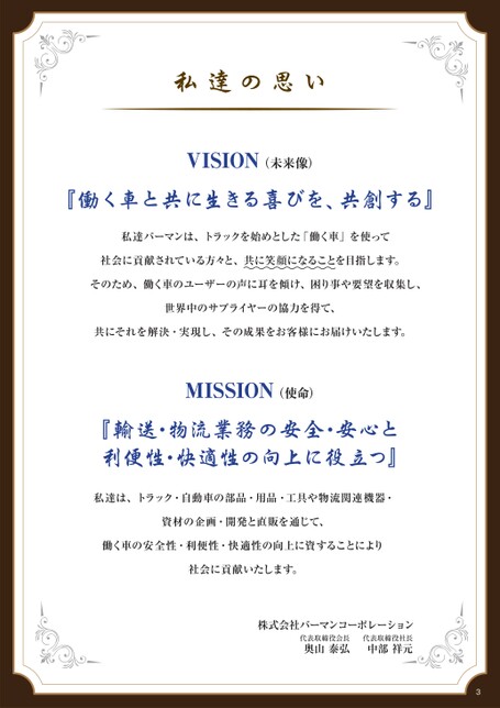 私達の思いVISION(未来像)『働く車と共に生きる喜びを、共創する』私達パーマンは、トラックを始めとした「働く車」を使って社会に貢献されている方々と、共に笑顔になることを目指します。そのため、働く車のユーザーの声に耳を傾け、困り事や要望を収集し、世界中のサプライヤーの協力を得て、共にそれを解決・実現し、その成果をお客様にお届けいたします。MISSION(使命)『輸送・物流業務の安全・安心と利便性・快適性の向上に役立つ』私達は、トラック・自動車の部品・用品・工具や物流関連機器・資材の企画・開発と直販を通じて、働く車の安全性・利便性・快適性の向上に資することにより社会に貢献いたします。株式会社パーマンコーポレーション代表取締役会長奥山泰弘代表取締役社長中部祥元3