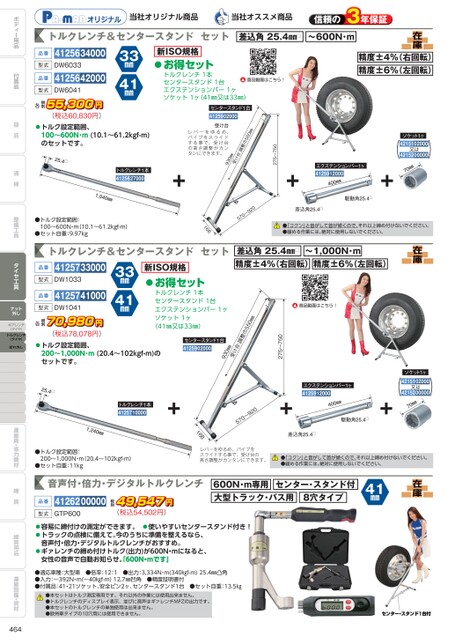 在庫精度±4%(右回転)精度±6%(左回転)新ISO規格お得セットトルクレンチ1本センタースタンド1台エクステンションバー1ヶソケット1ヶ(41㎜又は33㎜)商品動画はこちら!当社オリジナル商品当社オススメ商品トルクレンチ&センタースタンドセット差込角25.4㎜□〜600N・m421510200042152000004125912000275〜7504125902000受け台:調㎜039整巾550㎜レバーをゆるめ、パイプをスライドする事で、受け台の高さ調整がカンタンにできます。●「コクン」と音がして首が傾くので、それ以上締め付けないでください。●緩める作業には、絶対に使用しないでください。168920〜570●トルク設定範囲:100〜600N・m(10.1〜61.2kgf-m)●セット自重:9.97kg在庫差込角25.4㎜□精度±4%(右回転)精度±6%(左回転)〜1,000N・mトルクレンチ&センタースタンドセット商品動画はこちら!275〜750整巾550㎜受け台:調㎜039新ISO規格お得セットトルクレンチ1本センタースタンド1台エクステンションバー1ヶソケット1ヶ(41㎜又は33㎜)33㎜41㎜品番型式品番型式4125733000DW10334125741000DW104170,980円(税込78,078円)税別各トルク設定範囲、200〜1,000N・m(20.4〜102kgf-m)のセットです。4125902000412591200042151020004215200000●「コクン」と音がして首が傾くので、それ以上締め付けないでください。●緩める作業には、絶対に使用しないでください。920〜570レバーをゆるめ、パイプをスライドする事で、受け台の高さ調整がカンタンにできます。1684125710000●トルク設定範囲:●セット自重:11kg200〜1,000N・m(20.4〜102kgf-m)在庫41㎜600N・m専用大型トラック・バス用センター・スタンド付8穴タイプ音声付・倍力・デジタルトルクレンチ49,547円(税込54,502円)税別品番型式4126200000GTP600容易に締付けの測定ができます。使いやすいセンタースタンド付き!トラックの点検に備えて。今のうちに準備を整えるなら、音声付・倍力・デジタルトルクレンチがおすすめ。ギァレンチの締め付けトルク(出力)が600N・mになると、女性の音声で自動お知らせ。「600N・mです」●適応車種:大型車●倍率:12:1●出力:3,334N・m(340㎏●入力:〜392N・m(〜40㎏●付属品:41・21ソケット、安全ピン2ヶ、センタースタンド1台●セット自重:13.5㎏f-m)12.7㎜凹角●精度証明書付f-m)25.4㎜凸角●本セットはトルク測定専用です。それ以外の作業には使用出来ません。●トルクレンチのディスプレイ表示、並びに音声はギァレンチMPZの出力です。●本セットのトルクレンチの単独使用は出来ません。●欧州車タイプの10穴用には使用できません。33㎜41㎜品番型式品番型式4125634000DW60334125642000DW604155,300円(税込60,830円)税別各トルク設定範囲、100〜600N・m(10.1〜61.2kgf-m)のセットです。4125627000ボディー用品付属品部品清掃整備工具タイヤ工具ナット外しギアレンチ(タイヤ)チトルクレン(タイヤ)折れ外し運搬具・省力機材締具締具用品運搬設備・資材464