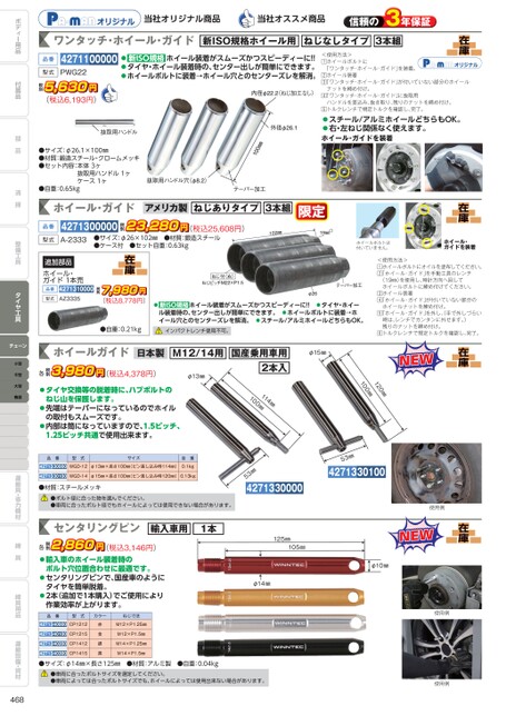 在庫当社オリジナル商品当社オススメ商品ワンタッチ・ホイール・ガイド新ISO規格ホイール用ねじなしタイプ3本組<使用方法>ホイールボルトに「ワンタッチ・ホイール・ガイド」を装着。ホイール装着「ワンタッチ・ホイール・ガイド」が付いていない部分のホイールナットを締め付け。「ワンタッチ・ホイール・ガイド」に抜取用ハンドルを差込み、抜き取り、残りのナットを締め付け。トルクレンチで規定トルクを確認し、完了。新ISO規格ホイール装着がスムーズかつスピーディーに!!タイヤ・ホイール装着時の、センター出しが簡単にできます。ホイールボルトに装着→ホイール穴とのセンターズレを解消。ねじ加工なし品番型式4271100000PWG22,5630円(税込6,193円)税別スチール/アルミホイールどちらもOK。右・左ねじ関係なく使えます。ホイール・ガイドを装着ホイールボルトは付いていません。ホイール・ガイドを装着在庫限定ホイール・ガイドアメリカ製ねじありタイプ3本組427130000023,280円(税込25,608円)税別A-2333●サイズ:φ26×102㎜●材質:鍛造スチール●ケース付●セット自重:0.63kg品番型式●サイズ:φ26.1×100㎜●材質:鍛造スチール・クロームメッキ●セット内容:本体3ヶ抜取用ハンドル1ヶケース1ヶ●自重:0.65kg<使用方法>ホイールボルトにオイルを塗布してください。「ホイール・ガイド」を手動工具のレンチ(19㎜)を使用し、時計方向へ回してホイールボルトに締め付けてください。ホイール装着「ホイール・ガイド」が付いていない部分のホイールナットを締め付け。「ホイール・ガイド」を外し、手で外しづらい時は、レンチでカンタンに外せます。)残りのナットを締め付け。トルクレンチで規定トルクを確認し、完了。新ISO規格ホイール装着がスムーズかつスピーディーに!!タイヤ・ホイール装着時の、センター出しが簡単にできます。ホイールボルトに装着→ホイール穴とのセンターズレを解消。スチール/アルミホイールどちらもOK。インパクトレンチ使用不可。在庫,7980円(税込8,778円)税別●自重:0.21kg追加部品ホイール・ガイド1本売品番型式4271310000AZ3335在庫NEWNEW110200㎜㎜使用例在庫NEWNEWφ10㎜㎜354271330100使用例使用例φ15㎜国産乗用車用2本入M12/14用φ13㎜ホイールガイド日本製,3980円(税込4,378円)税別各114㎜100㎜㎜354271330000タイヤ交換等の脱着時に、ハブボルトのねじ山を保護します。先端はテーパーになっているのでホイルの取付もスムーズです。内部は筒になっていますので、1.5ピッチ、1.25ピッチ共通で使用出来ます。品番型式サイズ自重4271330000WGD-12φ13㎜×長さ100㎜(ピン差し込み時114㎜)0.1kg4271330100WGD-14φ15㎜×長さ100㎜(ピン差し込み時120㎜)0.13kg●材質:スチールメッキ●ボルト径に合った物を選んでください。●車両に合ったボルト径でもホイールによっては使用できない場合があります。1本125㎜105㎜φ14㎜輸入車用センタリングピン,2860円(税込3,146円)各輸入車のホイール装着時のボルト穴位置合わせに最適です。センタリングピンで、国産車のように税別タイヤを簡単脱着。2本(追加で1本購入)でご使用により作業効率が上がります。品番型式カラーねじ寸法4271340000CP12124271340100CP12154271340200CP14124271340300CP1415赤金銀黒M12×P1.25㎜M12×P1.5㎜M14×P1.25㎜M14×P1.5㎜●サイズ:φ14㎜×長さ125㎜●材質:アルミ製●自重:0.04kg●車両に合ったボルトサイズを選定してください。●車両によっては合ったボルトサイズでも、ホイールによっては使用出来ない場合があります。ボディー用品付属品部品清掃整備工具タイヤ工具チェーン小型中型大型機器運搬具・省力機材締具締具用品運搬設備・資材468