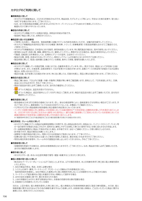 カタログのご利用に関して●掲載商品に関して・本カタログの掲載商品は、2025年3月現在のものです。商品改良、モデルチェンジ等により、予告なく仕様の変更や、取り扱いを終了する場合があります。ご了承ください。・なお、全ての取扱商品を掲載し切れませんのでECサイトパーマンショップでもあわせて検索してください。動画も付けて解りやすくなっています。●部品の供給に関して・本カタログに掲載されている商品の部品、消耗品の供給は可能です。・取扱終了商品に関しては、お問合せください。●商品取り扱いの注意事項・ご使用になる前に、商品本体、取扱説明書に記載されている内容をお読みいただき、記載内容を厳守してください。・本カタログ掲載商品を使用及び取り付ける機器(乗用車、トラック、各種電源等)の取扱説明書も合わせてご確認のうえ、ご使用ください。・本カタログの掲載商品は、日本国内における販売、使用を前提としています。特に電気製品の場合は、海外で使用しないでください。・使用前には必ず、各部に傷、損傷、等がないか、確認してください。異常がみられる場合は、製品の使用を中止してください。・可動部、回転部には作業前もしくは、定期的にグリースの塗布、注油を行ってください。・製品の分解、修理、改造は行わないでください。原則としてクレームの対象外となりますのでご注意ください。・製品保管に関して、取扱い説明書に記載されている環境、条件にて保管、管理をお願いいたします。●商品仕様に関して・本カタログに掲載している商品写真、仕様には寸法、自重等を表示しています。但し、表示寸法は、商品によって許容差(公差)が異なります。また、仕様変更、品質改善等で、寸法が変更される場合があります。設備スペースの新設等で詳細な寸法が必要な場合は、お問い合わせください。・商品の自重、色が変更になる場合があります。特に色に関しては、印刷の性質上、現品と異なる場合があります。ご了承ください。●商品の返品に関して・商品ご購入後は、7日以内に数量・外観・作動等に問題が無い事をご確認願います。原則として、7日を経過しますと、交換、返品に応じかねますので、予めご了承ください。・商品の返品送付前に必ずご連絡いただき、送付先の確認をしてください。返品不可がついた商品は、返品をお受けできません。注意!がついた商品は、返品手数料として1,100円(税込)ご請求します。商品の返品送付前に必ずご連絡いただき、送付先の・・返品確認をしてください。●販売価格に関して・販売価格は25年3月1日現在の価格になります。但し、急な仕様変更等により、価格変更せざるを得ない場合がございます。予めご了承ください。最新価格については当社WEBサイトもしくは、お電話にてご確認ください。・112号カタログより商品価格は税別価格と税込価格の併記表示になっております。・インボイス制度の開始に伴い都度払いのお客様においては請求書単位※1で各税率毎に消費税を計算し1円未満切り捨てとします。(2023年10月1日以降ご注文分より適用)また翌月払い、銀行自動口座振替にてご契約いただいているお客様においては締請求書単位で各税率毎に消費税を計算し1円未満切り捨てとします。※1複数税率を含むご注文や直送商品をご注文の場合請求書が分割される場合があります。●品質保証、クレーム対応に関して・本カタログに掲載されている商品の品質保証期間は3年間です。但し消耗品は除きます。消耗品とは、バッテリーやOリング、パッキン等の一回の使用で状態変化を起こすものや、使用すると摩耗しやがては消耗して無くなり使用できない状態に変化するものを指します。・万一品質保証期間内に商品に不具合が生じた場合、お手数ですが、当社へご連絡ください。引取り便をさしむけます。(お手数ですが、商品の梱包はお願いいたします。)・故障等での販売商品の取り外し、再取り付けはお客様のご負担になります。ご了承ください。・乱暴な取り扱いや本来の目的とは違ったご使用で故障した場合は、責任を負いかねますのでご了承ください。・特別な場合を除き修理中、クレーム中の代替製品の貸し出しは行っておりません。予めご了承ください。●有償修理に関して送付先の確認をお願いします。・有償修理を希望される場合は、送料はお客様負担となりますので、ご了承ください。なお、商品送付前に必ずご連絡いただき、●著作権に関して・本カタログの一部、あるいは全部を無断で複写・複製・転載することをかたく禁じます。●個人情報の取り扱いに関して・株式会社パーマンコーポレーション(以下「当社」とします)は、以下の場合を除き、本人の同意を得ずに第三者に個人情報を提供いたしません。1.当社の製品の受注、発送、決済に必要な場合2.システムの保守・運用、マーケティング、プロモーション活動などの外部委託先に対し、秘密保持契約を締結し、当社が委託した業務