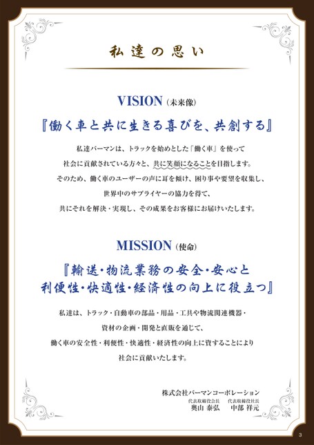VISION(未来像)私達パーマンは、トラックを始めとした「働く車」を使って社会に貢献されている方々と、共に笑顔になることを目指します。そのため、働く車のユーザーの声に耳を傾け、困り事や要望を収集し、世界中のサプライヤーの協力を得て、共にそれを解決・実現し、その成果をお客様にお届けいたします。MISSION(使命)私達は、トラック・自動車の部品・用品・工具や物流関連機器・資材の企画・開発と直販を通じて、働く車の安全性・利便性・快適性・経済性の向上に資することにより社会に貢献いたします。株式会社パーマンコーポレーション代表取締役会長奥山泰弘代表取締役社長中部祥元3