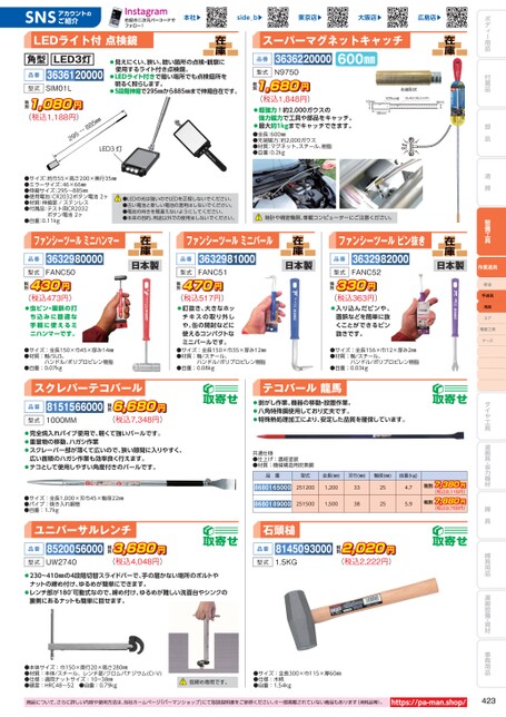 ボディー用品付属品部品清掃整備工具板金手道具用具エア電動工具ケースタイヤ工具運搬具・省力機材締具締具用品運搬設備・資材事務用品在庫在庫日本製作業道具本社▶side_b▶東京店▶大阪店▶広島店▶在庫SNSアカウントのご紹介Instagram右記の二次元バーコードでフォロー!LEDライト付点検鏡スーパーマグネットキャッチ600㎜先端形状品番3636220000,1680円税別型式N9750(税込1,848円)超強力!約2,000ガウスの強力磁力で工具や部品をキャッチ。最大約1kgまでキャッチできます。●全長:600㎜●先端磁力:約2,000ガウス●材質:マグネット、スチール、樹脂●自重:0.2kg角型LED3灯品番型式3636120000SIM01L見えにくい、狭い、暗い箇所の点検・観察に使用するライト付き点検鏡。LEDライト付きで暗い場所でも点検個所を明るく照らします。5段階伸縮で295㎜から885㎜まで伸縮自在です。㎜588LED3灯592,1080円税別(税込1,188円)〜ファンシーツールピン抜き品番3632982000●サイズ:全長156×巾12×厚み2㎜●材質:軸/スチール、ハンドル/ポリプロピレン樹脂●自重:0.03kg(税込363円)入り込んだピンや、画鋲などを簡単に抜くことができるピン抜きです。型式FANC52330円税別在庫日本製ファンシーツールミニバール品番3632981000●サイズ:全長150×巾35×厚み12㎜●材質:軸/スチール、ハンドル/ポリプロピレン樹脂●自重:0.08kg(税込517円)釘抜き、大きなホッチキスの取り外しや、缶の開封などに使えるコンパクトなミニバールです。型式FANC51470円税別在庫日本製ファンシーツールミニハンマー品番3632980000型式FANC50430円税別(税込473円)虫ピン・画鋲の打ち込みに最適な手軽に使えるミニハンマーです。●サイズ:全長150×巾45×厚み14㎜●材質:軸/SUS、ハンドル/ポリプロピレン樹脂●自重:0.07kg●サイズ:約巾55×高さ200×奥行35㎜●ミラーサイズ:46×66㎜●伸縮サイズ:295〜885㎜●使用電池:CR2032ボタン電池2ヶ●材質:伸縮部/ステンレス●付属品:テスト用CR2032ボタン電池2ヶ●自重:0.11kg●LEDの光は強いのでLEDを正視しないでください。●古い電池と新しい電池の混用はしないでください。●電池の向きを間違えないようにしてください。●本来の目的、用途以外での使用はしないでください。時計や精密機器、車載コンピューターにご注意ください。税別税別,7380円(税込8,118円),7880円(税込9,768円)テコバール龍馬剥がし作業、機器の移動・設置作業。八角特殊鋼使用しており丈夫です。特殊熱処理加工により、安定した品質を確保しています。共通仕様●仕上げ:濃紺塗装●材質:機械構造用炭素鋼品番型式全長(㎜)刃巾(㎜)軸径(㎜)自重(kg)86801650002512001,20086801890002515001,500333825254.75.9,2020円税別(税込2,222円)石頭槌品番型式81450930001.5KG,6680円税別(税込7,348円)品番型式81515660001000MMスクレパーテコバール完全焼入れパイプ使用で、軽くて強いバールです。重量物の移動、ハガシ作業スクレーバー部が薄くて広いので、狭い間に入りやすく、広い面積のハガシ作業も効率良く行えます。テコとして使用しやすい角度付きのバールです。●サイズ:全長1,000×刃巾45×軸径22㎜●パイプ:焼き入れ鋼管●自重:1.7kg税別ユニバーサルレンチ,3680円8520056000品番型式UW2740(税込4,048円)230~410㎜の4段階切替スライドバーで、手の届かない場所のボルトやナットの締め付け、ゆるめが簡単にできます。レンチ部が180°可動式なので、締め付け、ゆるめが難しい洗面台やシンクの裏側にあるナットも簡単に回せます。●本体サイズ:巾150×奥行20×高さ280㎜●材質:本体/スチール、レンチ部/クロムバナジウム(Cr-V)●仕様:適用ナットサイズ:10~38㎜●硬度:HRC48〜52●自重:0.79kg仮締め専用です。●サイズ:全長300×巾115×厚60㎜●仕様:木柄●自重:1.54kg商品について、さらに詳しい内容や使用方法は、当社ホームページ「パーマンショップ」にて取扱説明書をご参照ください。※一部掲載されていない商品もあります(消耗品等)。https://pa-man.shop/