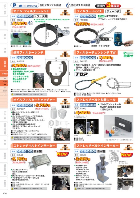 在庫フィルター・レンチチェーン式品番3638700000型式FT935Bφ160㎜まで外せます。ダブルチェーン式で把握力抜群!,5680円(税込6,248円)税別在庫トラック用スチールバンドでガッチリオイルフィルターをつかめます。オイル・フィルター・レンチ品番3638820000,2020円(税込2,222円)税別型式153-2ハンドルは短く、スペースのない個所での作業が簡単かつ確実に行えます。チェーン脱落防止付フィルターチェンレンチTW,7680円(税込8,448円)税別品番型式8002300000TW-23094㎜在庫30803850燃料フィルターレンチ品番3638900000,5280円(税込5,808円)税別型式A-1628差込部の形状が星形8角形になっており、多くの角度でソケットレンチを差し込むことができます。ラチェットレンチ・アダプターは付いていません。●材質:スチール●自重:0.5kg●自重:1kg乗用車→トラックまで在庫●呼び寸法:230㎜●くわえられる直径:200㎜●チェンの長さ:700㎜●L:233㎜●自重:530gストレッチベルト脱着ツール品番3639050000型式FT973ベルトテンショナーの無い車への脱着が簡単に行なえます。,5083円(税込5,592円)税別※2本掛けのプーリーには使用できません。脱着時装着前●材質:アルミ●自重:0.37kg※2本掛けのプーリーには使用できません。在庫NEWストレッチベルトインサーター品番3639052000日本製,3680円(税込4,048円)軽自動車に多く採用されている2本掛けタイプのストレッチベルト取付専用工具。税別型式SI-52S横向きエンジンの狭いスペースでも簡単にベルト装着が可能。●サイズ:巾80×奥行94×厚み10㎜●材質:スチール●差込角:1/2インチ(12,7□㎜)●差込部形状:星形八角形●適応車種:ふそう・キャンター3.5T・6.7T・6.9T●自重:0.21kgろ過交換タイプ専用のフィルターレンチです。在庫日本製在庫NEWオイルフィルターキャッチャー,3780円(税込4,158円)税別品番型式3638890000AVP637●サイズ:上部φ90×下部φ62×高さ178㎜●材質:ポリプロピレン●耐熱温度:ボトル120℃、カップ140℃●自重:0.07kg本製品はオイルフィルターレンチではありません。緩め作業はオイルフィルターレンチを使用してください。ストレッチベルトインサーター品番3639051000日本製,5180円(税込5,698円)税別型式SI-34SスズキSエネチャージなどの、3点掛けにも対応。狭いエンジンルームのプーリー周りに最適。ネジ部センターアダプターを外した開口部寸法最大34㎜。緩めたオイルフィルターを取り外す際に使用。オイルをしっかりとキャッチできるので、手を汚さずにオイル交換が可能。多段カップ形状で、下向きオイルフィルター主要4サイズに対応。ボトルの容量は250㎖あるので、多量のオイルでもしっかりとキャッチできます。●全長:45㎜●材質:(本体)炭素鋼、クロムメッキ(ボルト)ステンレス鋼●自重:0.06kg車輌によっては使用できない場合があります。●全長:63㎜●材質:(本体)炭素鋼、クロムメッキ(ボルト)ステンレス鋼●自重:0.09kg車輌によっては使用できない場合があります。当社オリジナル商品当社オススメ商品ボディー用品付属品部品清掃整備工具作業道具板金手道具用具エア電動工具ケースタイヤ工具運搬具・省力機材締具締具用品運搬設備・資材事務用品426