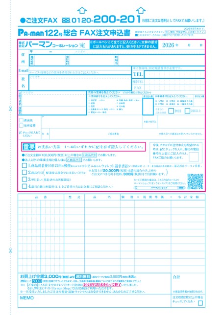 ●ご注文FAX0120-200-201(初回ご注文は原則としてFAXでお願いします。)122号総合FAX注文申込書2026年8月末まで。期限後でもご注文できます。但し価格・仕様変更にご注意ください。■このままコピーされると、何回でもご使用いただけます。※ボールペンにて全てご記入ください。太枠の部分に記入もれがありますと、受け付けができません。2026年月日E-mailサービス・情報などの案内を希望される方はご記入ください。宛フリガナ市区町村〒都道府県住所※ご登録時、固定電話番号が必要です。町域名TEL携帯TELFAX貴社の業種を教えてくださいⒶ業種番号を記入してください。1運送業→Ⓑへ2建築3農業4自動車ディーラ/販売→Ⓑへ5製造メーカー/販売6整備/板金/修理→Ⓑへ7倉庫業8その他9個人(Ⓐから順にお答えください)番号記入欄Ⓑ車種番号を記入してください。番号記入欄11大型車12中型車13小型車14乗用車15四輪車その他16二輪車その他今までのご注文回数初回2回以上お届け先TELご担当者名※個人宅への直送はお受けいたしておりません。フリガナ社名フリガナご担当者名役職名〒□直送先□住所変更□チェックを入れてください社名重要お支払い方法1〜4のいずれかに□を必ず記入してください。●ご注文金額が100,000円(税別)以上の場合は2.商品代引でお願いします。●法人以外の事業主様と個人様は2.商品代引でお願いします。今後、カタログの送付中止を希望される時は、□にチェックを入れ、貴社の電話番号を上記にご記入のうえ、FAXご協力お願いします。(1.商品到着後10日以内の郵便振込み又はコンビニ振込み、ウォレット請求書払い(用紙同封・メーカー直送商品は後日郵送)。2.商品代引配達時に現金でお支払いください3.翌月払い(契約済のお客様限定)4.銀行自動口座振替(3.4.をご希望の方はお気軽にご相談ください。)ご注文につき代引手数料、300円(税別)をご負担願います。※お買上げ20,000円(税別)未満の場合のみ、1回の)カードご使用の場合は、こちらのQRコードよりパーマンショップ(オンラインストア)をご利用ください。パーマンショップ検索振込料はパーマン負担。品番型式品名個数×税別単価=小計金額送料無料(送料パーマン負担)3,000円(税別)未満は、お買上げ金額3,000円(税別)より送料として500円(税別)加算させていただきます。(但し、北海道・沖縄本島・離島についてはカタログ裏面をご参照ください。)※1【ご案内】FAX注文でのクレジットカード決済は2026年2月末をもって終了いたしました。なお、弊社ECサイト「Pa-manShop」では引き続きご利用いただけます。※一旦受注いたしましたご注文の変更・追加・キャンセルはお受けできません。あらかじめご了承ください。MEMO合計※別途消費税が加算されます。注文枚数2枚以上の場合チェックしてください