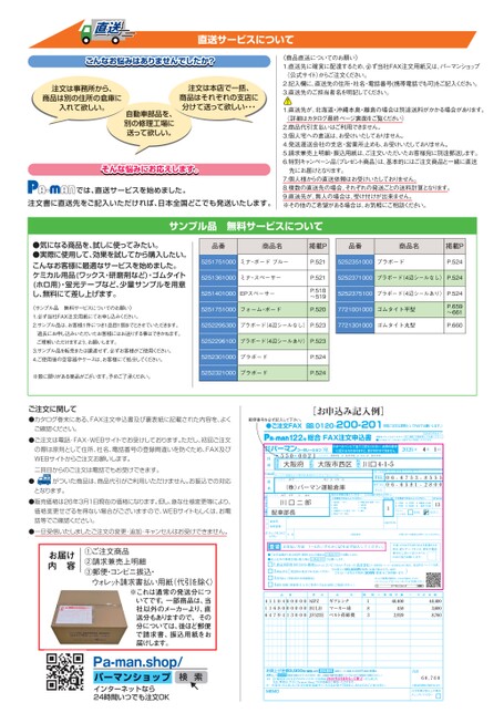 直送直送サービスについてこんなお悩みはありませんでしたか?注文は事務所から、商品は別の住所の倉庫に入れて欲しい。注文は本店で一括、商品はそれぞれの支店に分けて送って欲しい・・・自動車部品を、別の修理工場に送って欲しい。そんな悩みにお応えします。では、直送サービスを始めました。注文書に直送先をご記入いただければ、日本全国どこでも発送いたします。《商品直送についてのお願い》1.直送先に確実に配達するため、必ず当社FAX注文用紙又は、パーマンショップ(公式サイト)からご注文ください。2.記入欄に、直送先の住所・社名・電話番号(携帯電話でも可)をご記入ください。3.直送先のご担当者名を明記してください。1.直送先が、北海道・沖縄本島・離島の場合は別途送料がかかる場合があります。(詳細はカタログ最終ページ裏面をご覧ください)2.商品代引支払いはご利用できません。3.個人宅への直送は、お受けいたしておりません。4.発送運送会社の支店・営業所止めも、お受けいたしておりません。5.請求兼売上明細・振込用紙は、ご注文いただいたお客様宛に別途郵送します。6.特別キャンペーン品(プレゼント商品)は、基本的にはご注文商品と一緒に直送先にお届けとなります。7.個人様からの直送依頼はお受けいたしておりません。8.複数の直送先の場合、それぞれの発送ごとの送料計算となります。9.直送先が、無人の場合は、受け付けが出来ません。※その他のご希望がある場合は、お気軽にご相談ください。サンプル品無料サービスについて●気になる商品を、試しに使ってみたい。●実際に使用して、効果を試してから購入したい。こんなお客様に最適なサービスを始めました。ケミカル用品(ワックス・研磨剤など)・ゴムタイト(ホロ用)・蛍光テープなど、少量サンプルを用意し、無料にて差し上げます。《サンプル品無料サービスについてのお願い》1.必ず当社FAX注文用紙にてお申し込みください。2.サンプル品は、お客様1件につき1品目1個までとさせていただきます。過去にお申し込みいただいたお客様にはお送りする事はできかねます。ご理解いただけますよう、お願いします。3.サンプル品を転売または譲渡せず、必ずお客様がご使用ください。4.ご使用後の空容器やケースは、お客様にて処分してください。※数に限りがある商品がございます。予めご了承ください。品番商品名掲載P品番商品名5251751000ミナ・ボードブルーP.5215252351000プラボード掲載PP.5245251361000ミナ・スペーサー5251401000EPスペーサー5251751000フォーム・ボードP.521P.518〜519P.5205252371000プラボード(4辺シールなし)P.5245252375100プラボード(4辺シールあり)P.5247721001000ゴムタイト平型5252295300プラボード(4辺シールなし)P.5237721301000ゴムタイト丸型5252296100プラボード(4辺シールあり)P.5235252301000プラボード5252321000プラボードP.524P.524P.659〜661P.660品名個数×税別単価=小計金額48,4003,6008,76048,4004502,920183ギアレンチマーカー球ベルト荷締機品番416114167089404001003000000000型式MPZBULBJF523E送料無料(送料パーマン負担)3,000円(税別)未満は、お買上げ金額3,000円(税別)より送料として500円(税別)加算させていただきます。(但し、北海道・沖縄本島・離島についてはカタログ裏面をご参照ください。)※1【ご案内】FAX注文でのクレジットカード決済は2026年2月末をもって終了いたしました。なお、弊社ECサイト「Pa-manShop」では引き続きご利用いただけます。※一旦受注いたしましたご注文の変更・追加・キャンセルはお受けできません。あらかじめご了承ください。MEMO合計60,760※別途消費税が加算されます。注文枚数2枚以上の場合チェックしてください※これは通常の発送分についてです。一部商品は、当社以外のメーカーより、直送分もありますので、その分については、後ほど郵便で請求書、振込用紙をお届けします。Pa-man.shop/パーマンショップインターネットなら24時間いつでも注文OK検索122号総合FAX注文申込書2026年8月末まで。期限後でもご注文できます。但し価格・仕様変更にご注意ください。■このままコピーされると、何回でもご使用いただけます。年月日41宛※ボールペンにて全てご記入ください。太枠の部分に記入もれがありますと、受け付けができません。2026フリガナオオサカフオオサカシニシクカワグチ川口町域名大阪市西区00市区町村2551大阪府0〒都道府県住所[お申込み記入例]郵便番号を必ず記入して下さい。●ご注文FAX0120-200-201(初回ご注文は原則としてFAXでお願いします。)※ご登録時、固定電話番号が必要です。0066--66755831--82585050TEL携帯TELFAX(Ⓐから順にお答えください)番号記入欄Ⓑ車種番号を記入してください。番号記入欄111大型車12中型車13小型車14乗用車15四輪車その他16二輪車その他13今までのご注文回数初回2回以上お届け先TEL貴社の業種を教えてくださいⒶ業種番号を記入してください。1運送業→Ⓑへ2建築3農業4自動車ディーラ/販売→Ⓑへ5製造メーカー/販売6整備/板金/修理→Ⓑへ7倉庫業8その他9個人ご担当者名※個人宅への